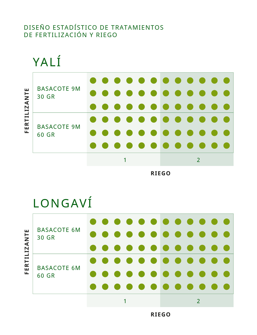 Las acciones siguientes contemplaron el diseño e implementación de las técnicas de manejo: poda, la implementación de los sistemas de riego y el diseño estadístico de tratamientos de fertilización.
